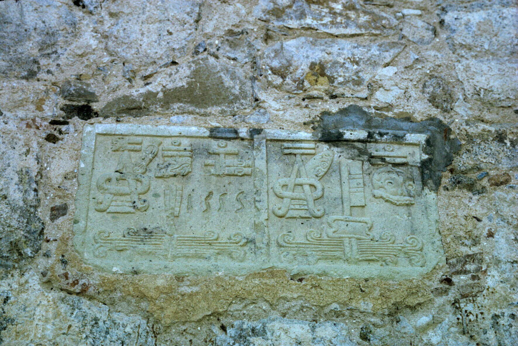 stenen reliëf met pre-Columbiaanse en Europese datum
