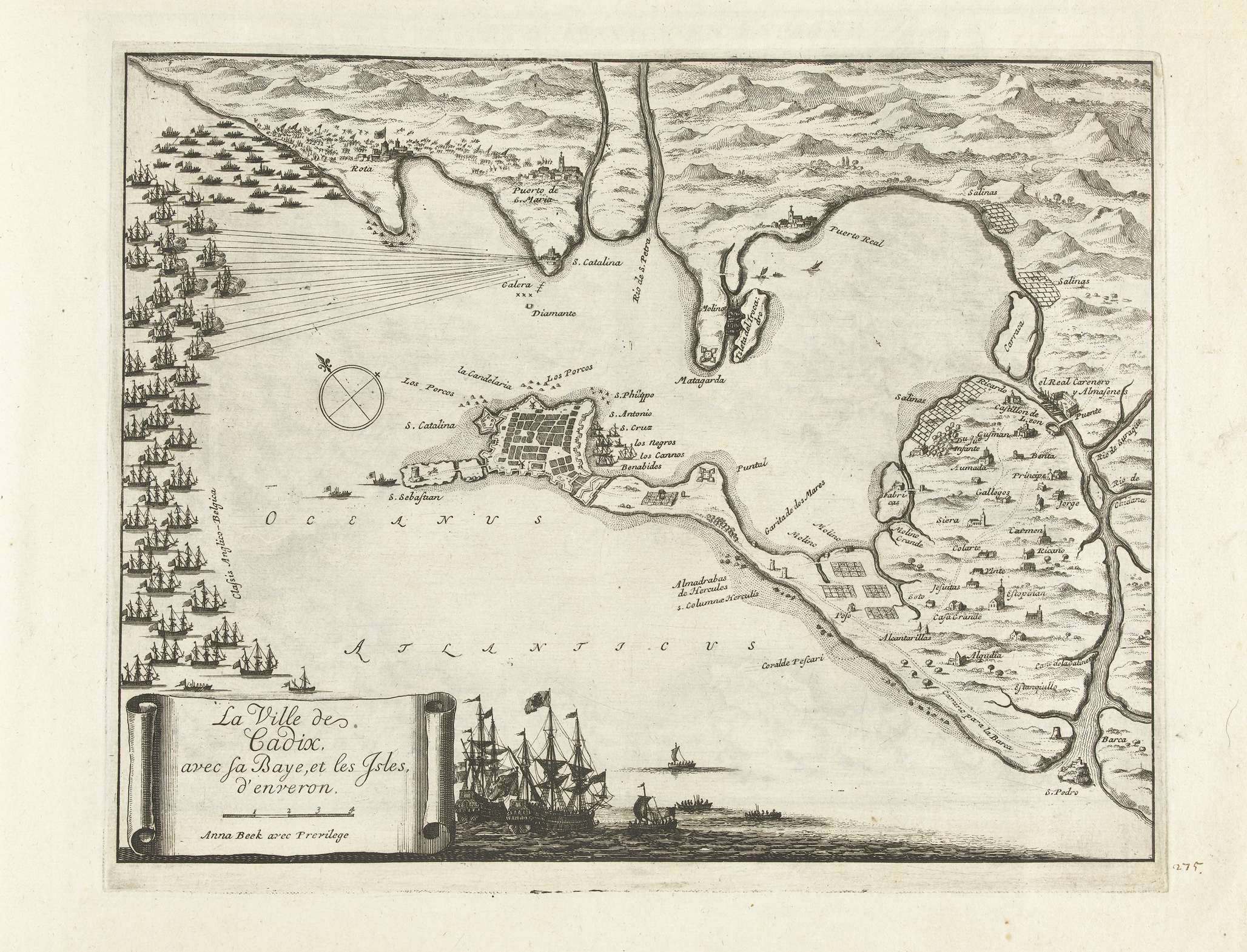 Kaart met de strijd om Cadiz, 1702
