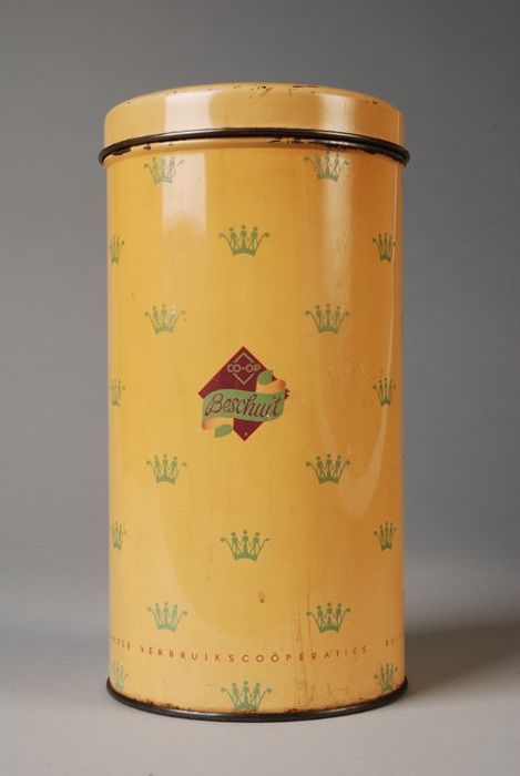 Cilindrisch geel Co-op beschuitblik, met blauwe deco...