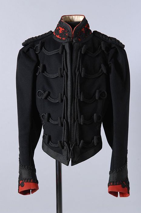 Getailleerd amazonejasje van zwart laken met rode mo...