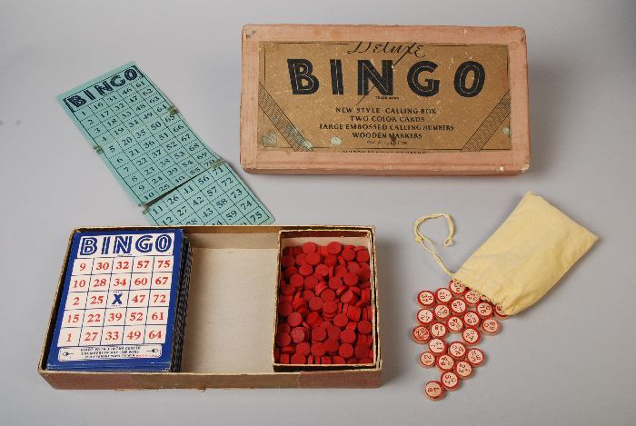 Doos met bingo spel: bingokaarten, geel zakje fiches...