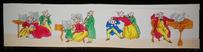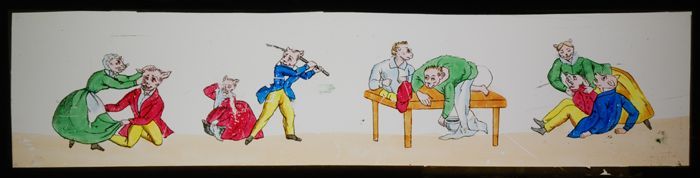 Lantaarnplaat met aangeklede honden, katten en apen ...