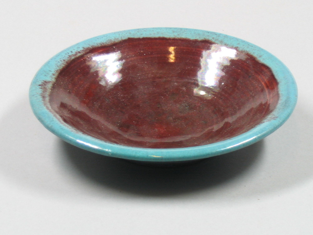 bord van keramiek, donkerroodbruin met zeegroene ran...