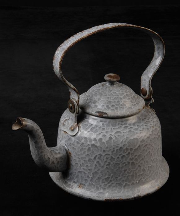 Kleine grijs gewolkte waterketel met losse deksel en...