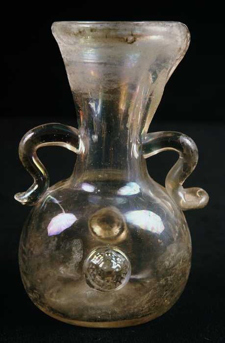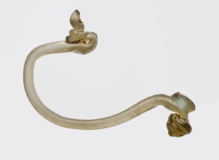 Oor van licht groen glas, gekruld met eikelvorm op d...
