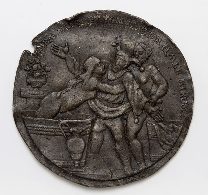 Tinnen penning of sierbeslag met voorstelling nar en...