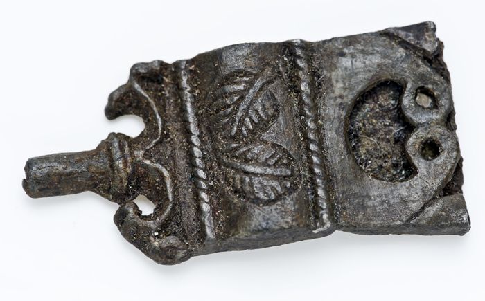 Fragment tinnen beslag, riemtong, gegraveerde blader...