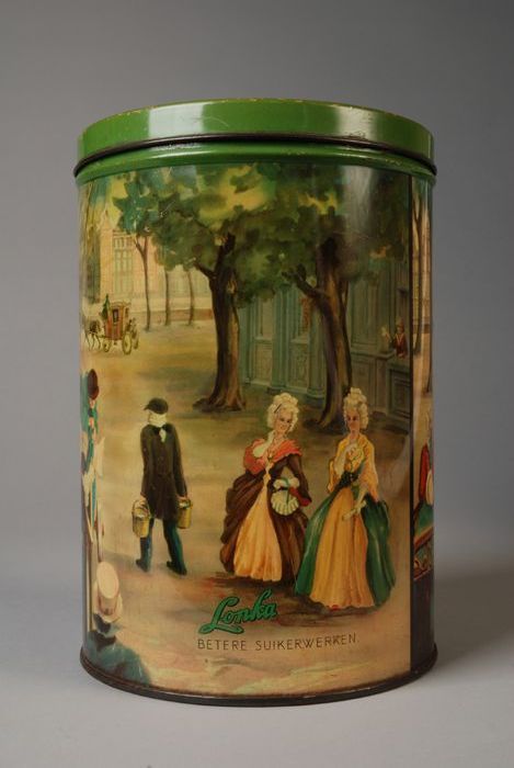 Cilindervormig gekleurd blik met "Lonka, betere suik...