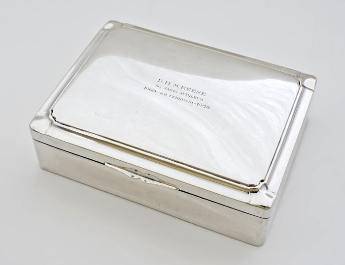Zilveren sigarendoos met "D.H.M. REESE 50 JARIG JUBI...