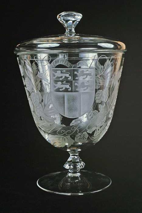 Glazen bokaal, gegraveerd met "D.H.M. Reese 1880-195...