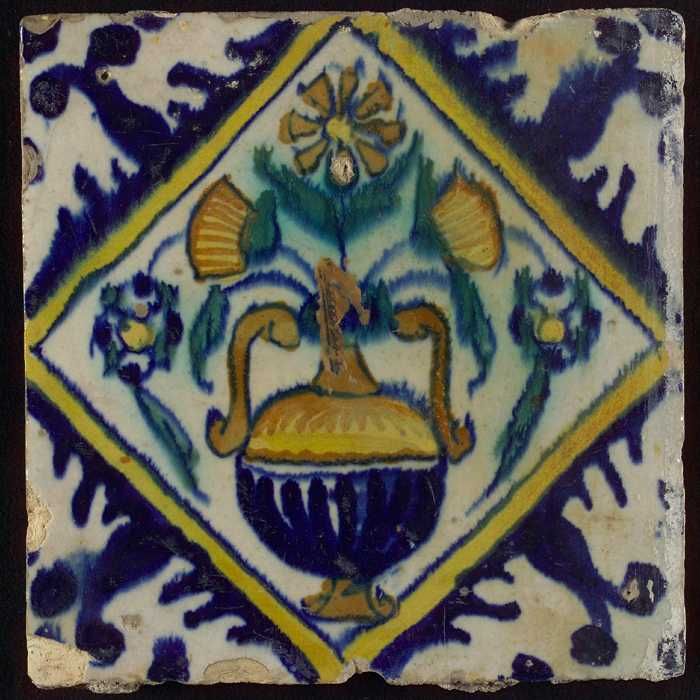 Bloemtegel, bloempot in kwadraat, hoekmotief palmet