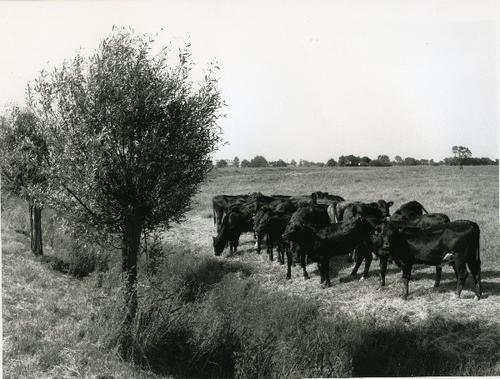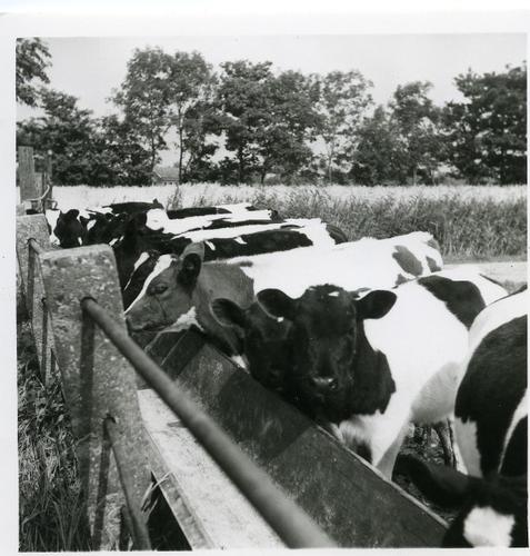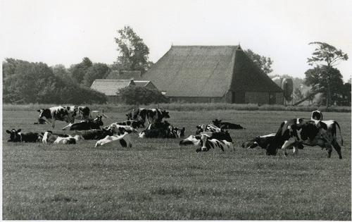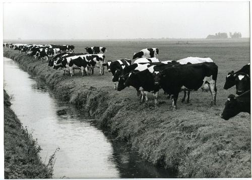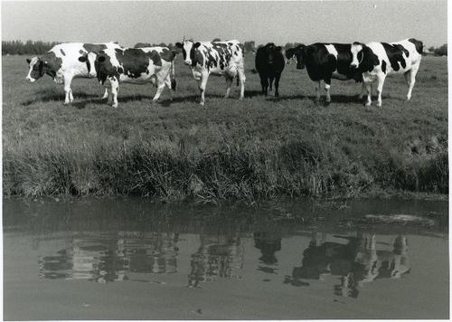 Foto in zwart-wit van koeien in een weiland bij een ...