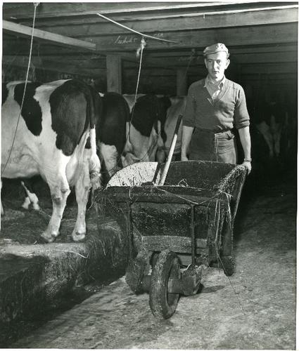 Foto in zwart-wit van een boer met een houten kruiwa...