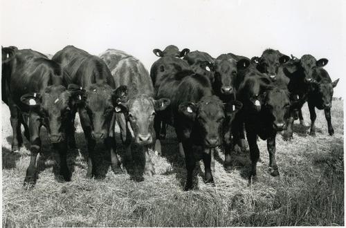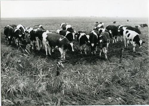 Foto in zwart-wit van koeien in een weiland afgezet ...