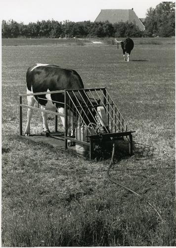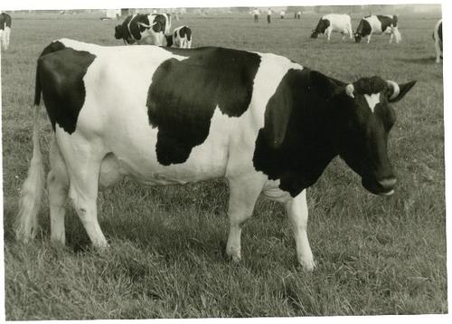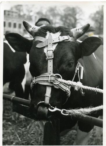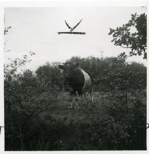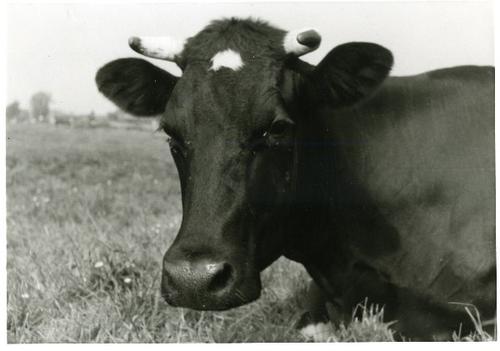 Foto in zwart-wit van een Lakenvelder stier, 1968