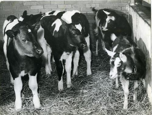 Foto in zwart-wit van kalveren en geiten in een stal...