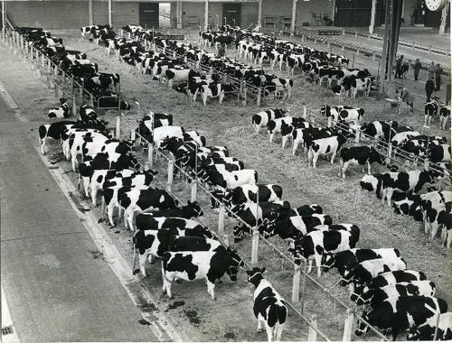 Foto in zwart-wit van een overdekte veemarkt door J....