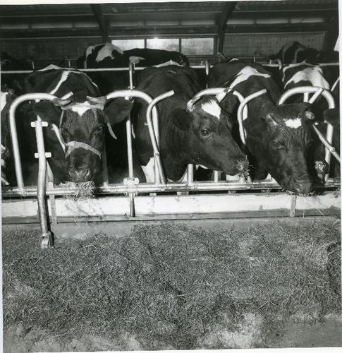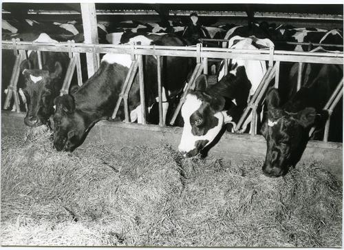 Foto in zwart-wit van etende koeien in een ligboxens...
