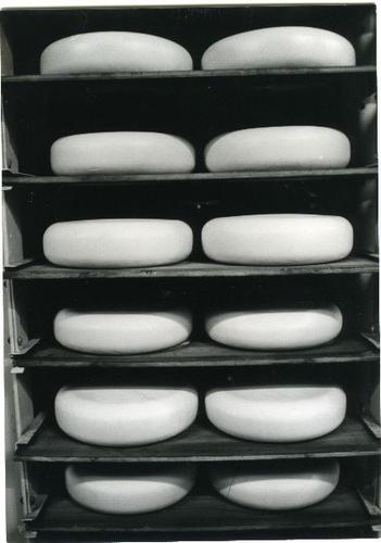 Foto in zwart-wit van de opslag van kaas door De Fri...