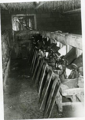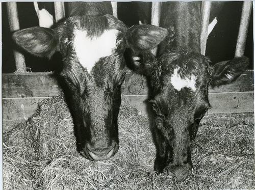 Foto in zwart-wit van drinkende kalveren in een stal...