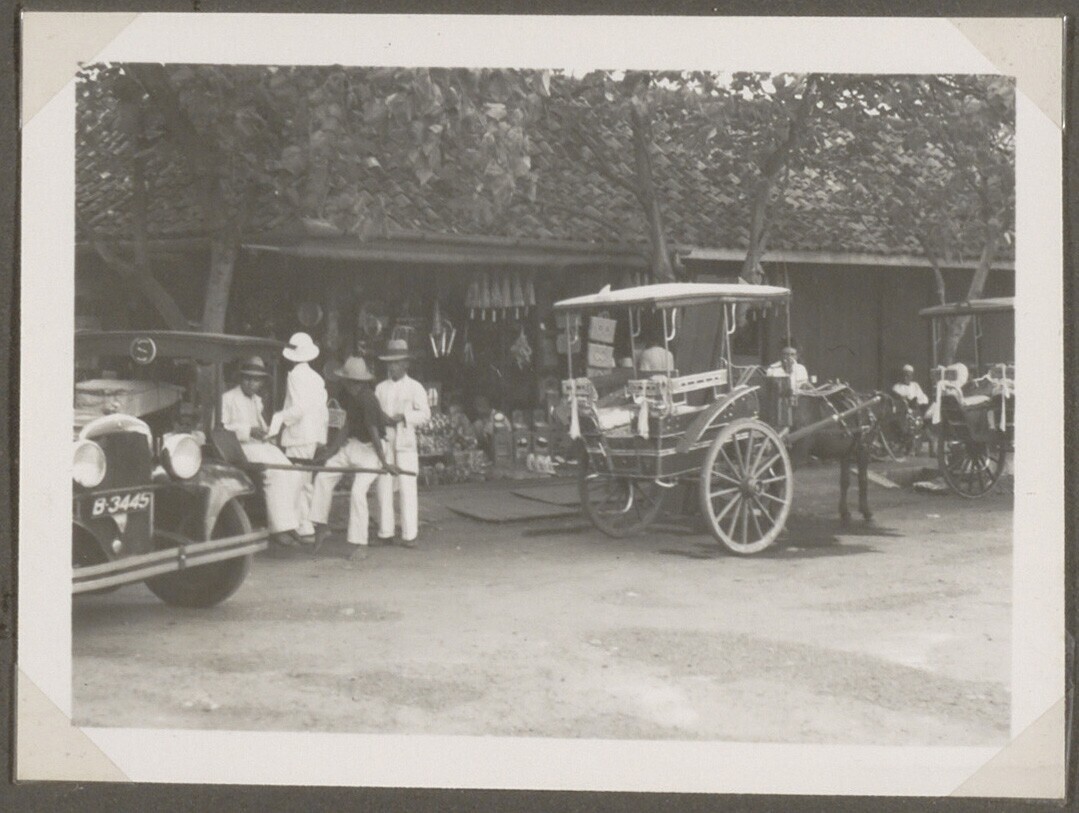 Welkomspoort met auto en Javanen langs de kant van d...