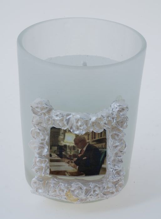 Waxinelichtje met portret van Pim Fortuyn aan zijn b...