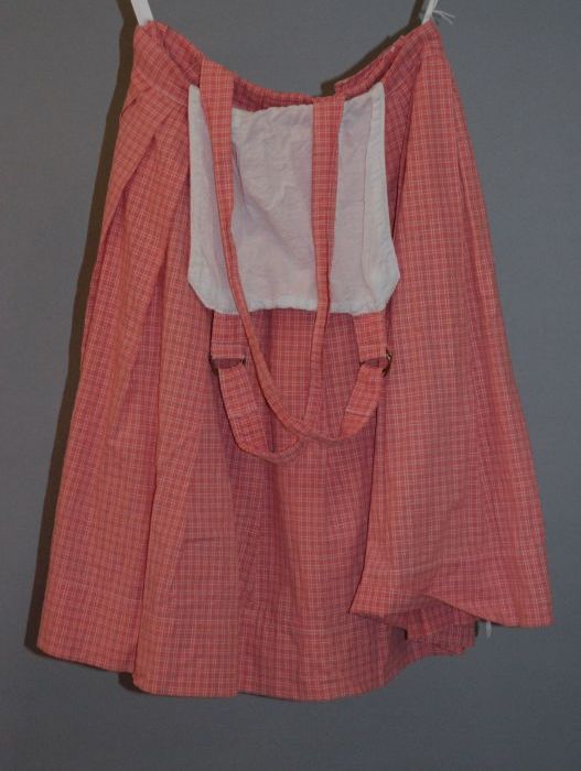 Rokje, roze geruite ploegstof, met borststuk en banden