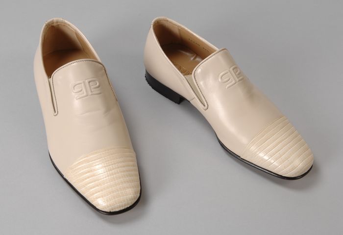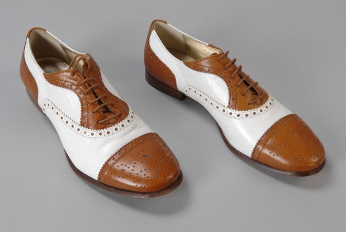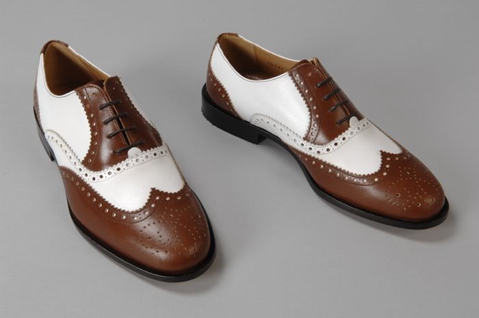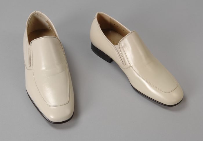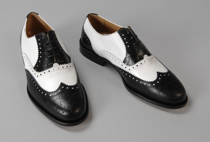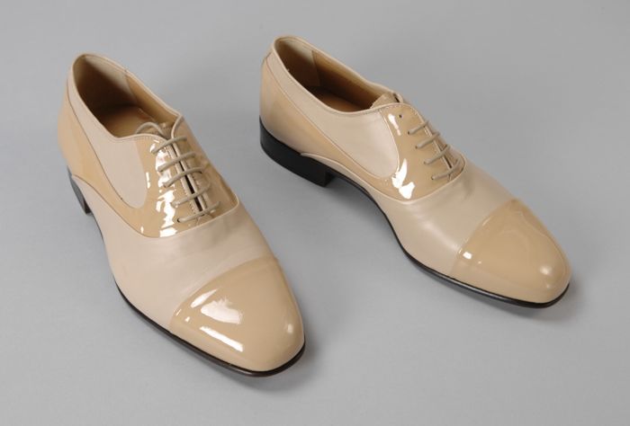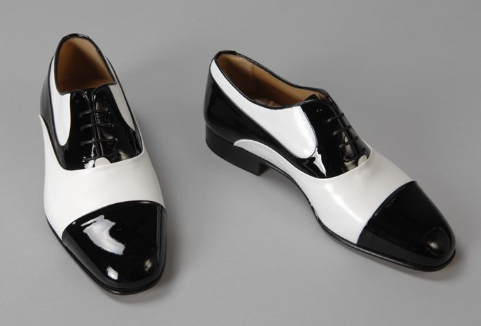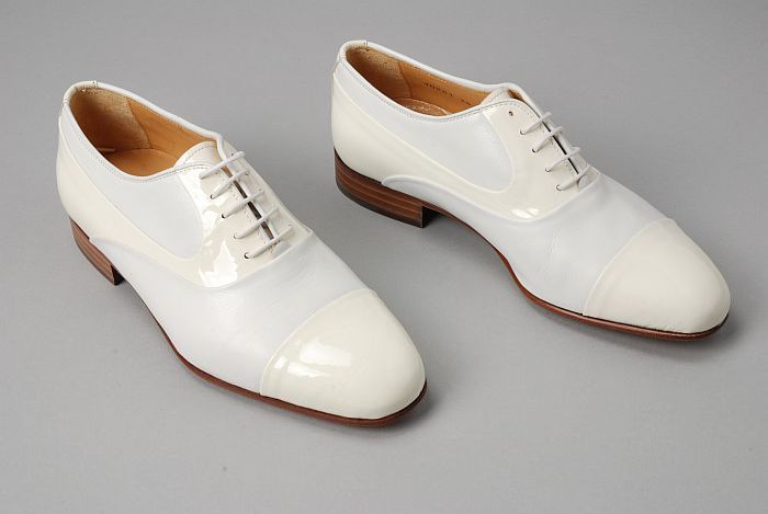 Paar herenschoenen van wit leer met zwarte lakneus, ...