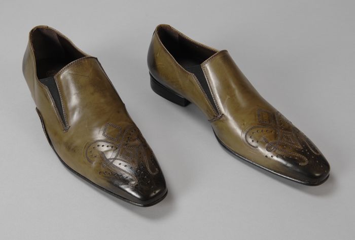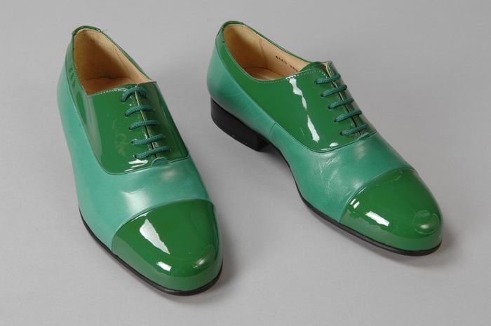 Paar groene herenschoenen, loafers, lange neus, klei...