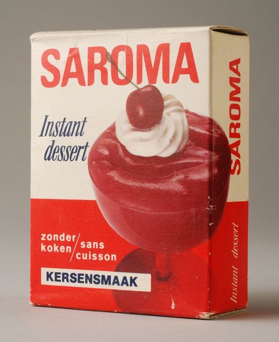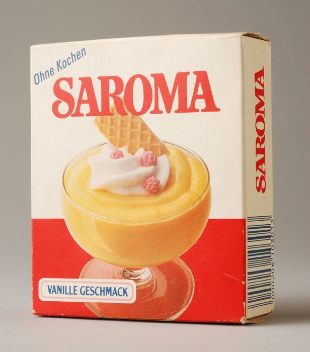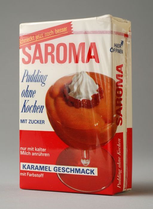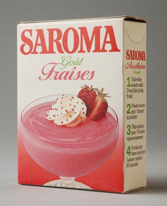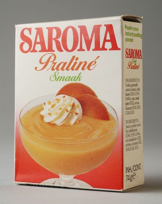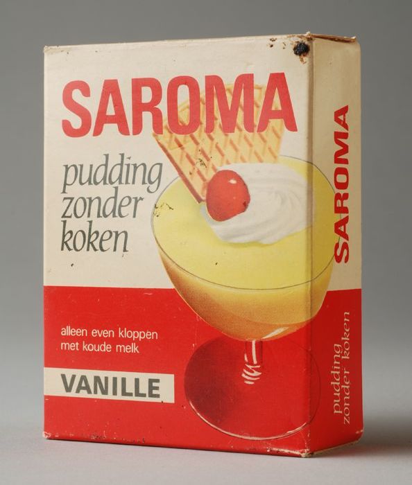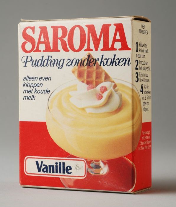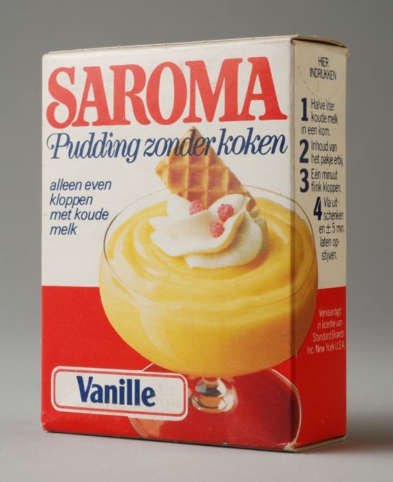 Wit, kartonnen pak SAROMA pudding zonder koken, aard...