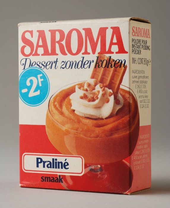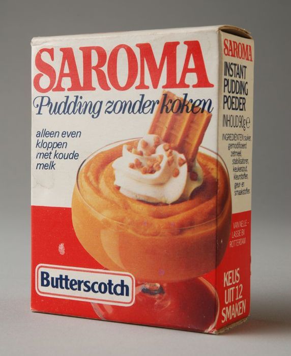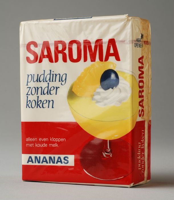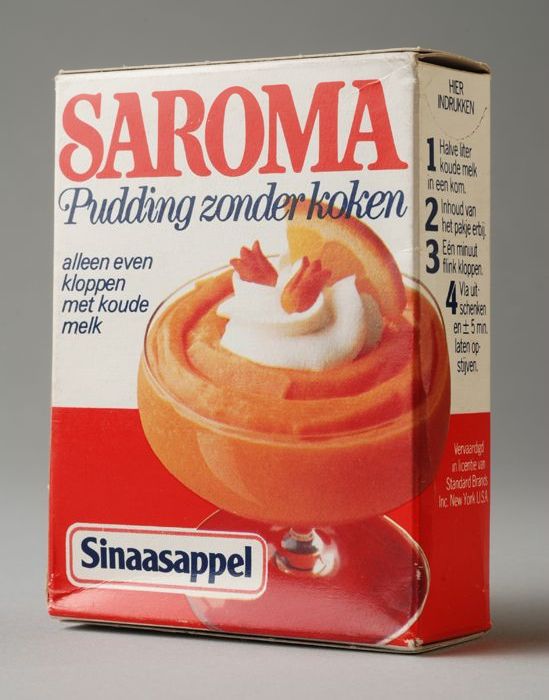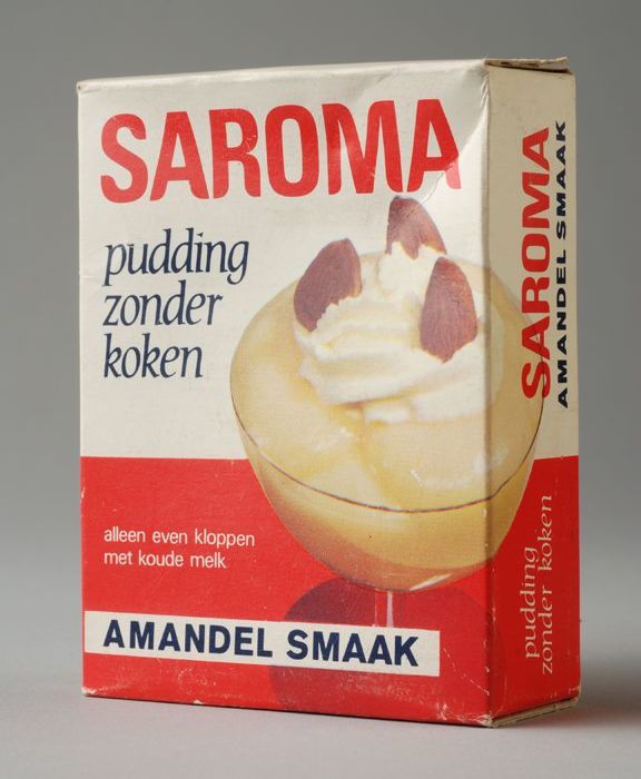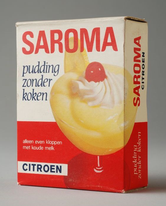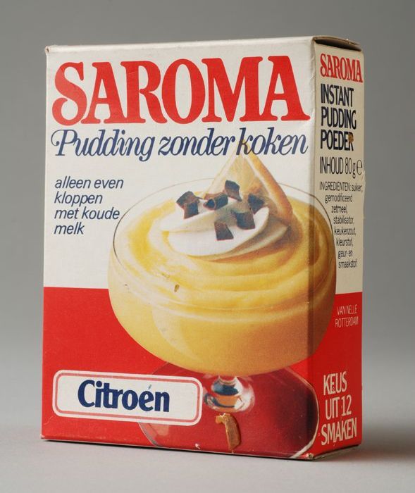 Wit, kartonnen pak SAROMA pudding zonder koken, sina...