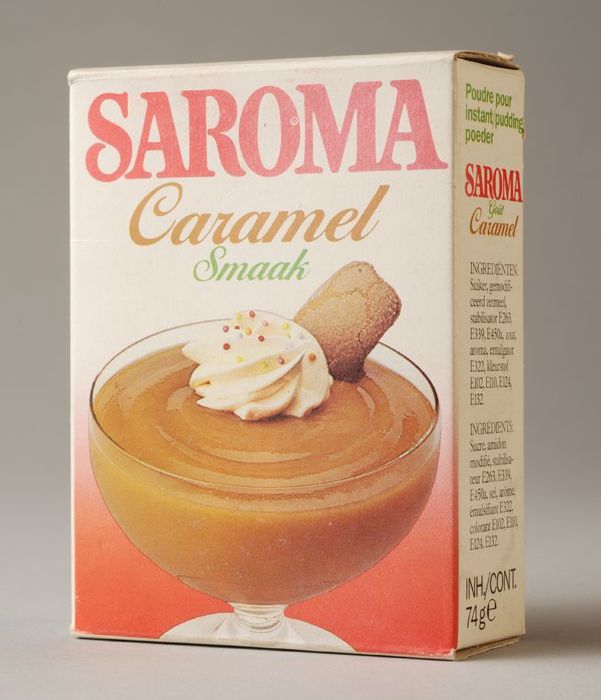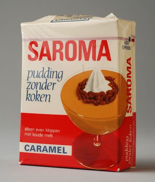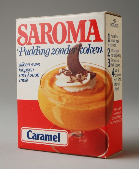 Wit, kartonnen pak SAROMA pudding zonder koken, cara...