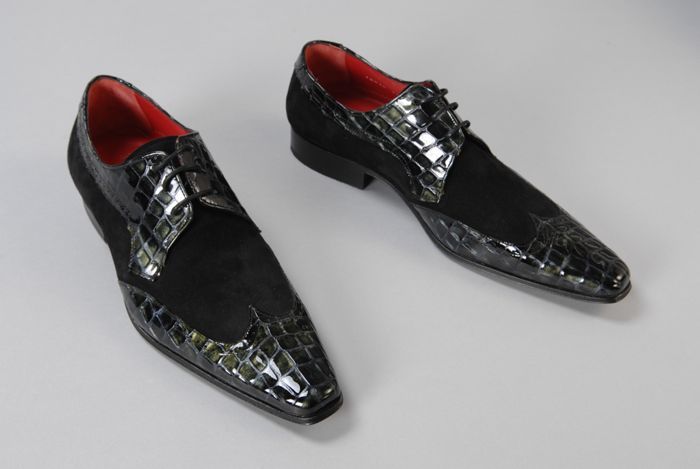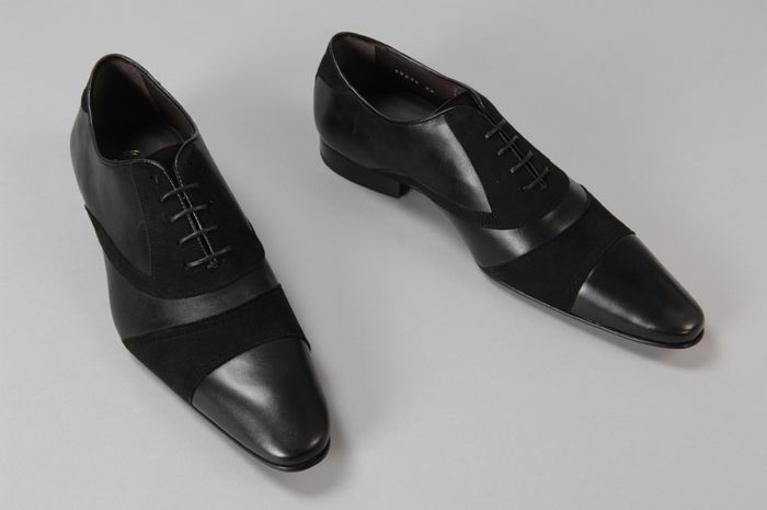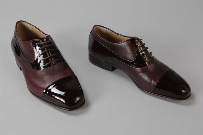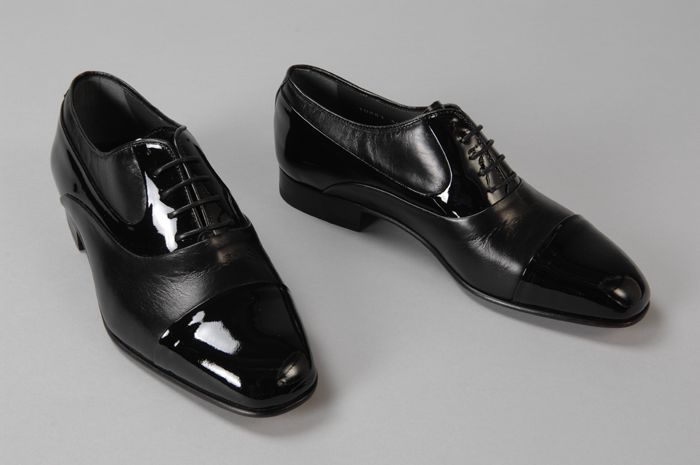 Paar herenschoenen van zwart leer met zwarte lakneus...