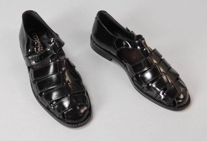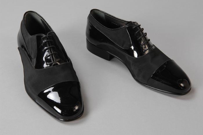 Paar herenschoenen van zwarte zijde met zwarte lakne...