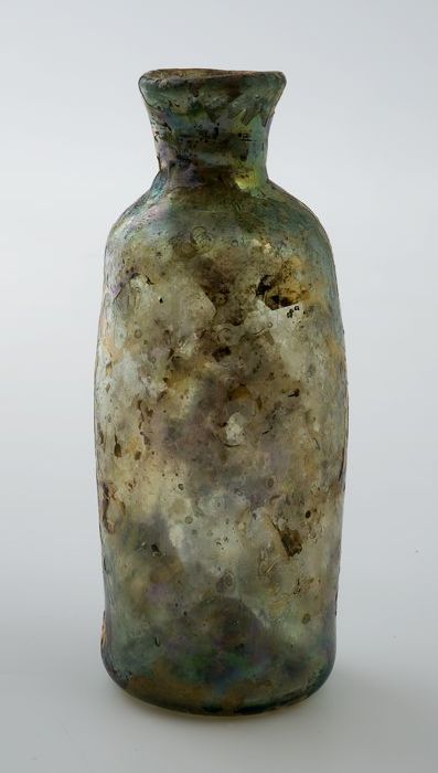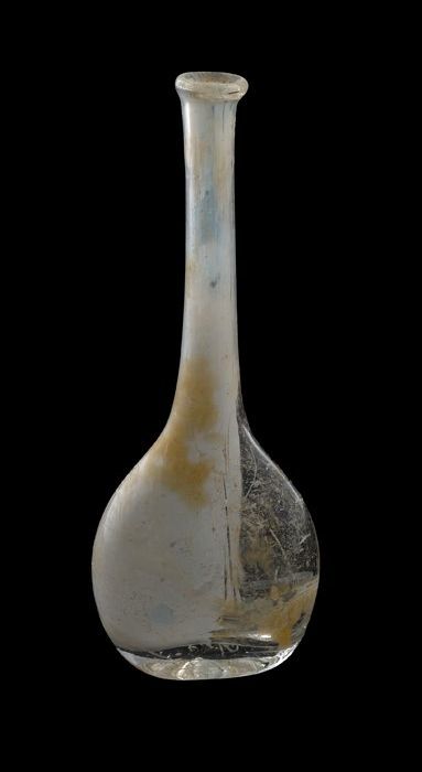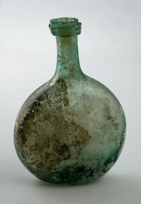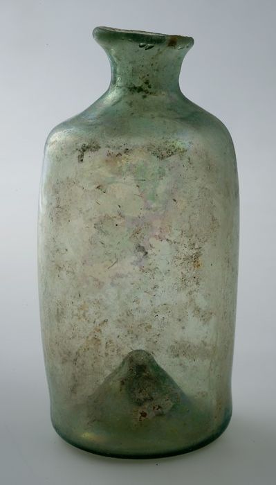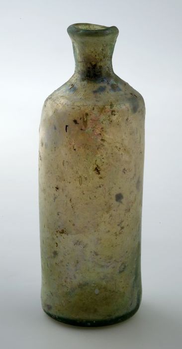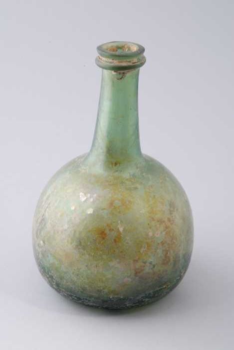 Kleine groene fles met ovaal lichaam en lange hals, ...