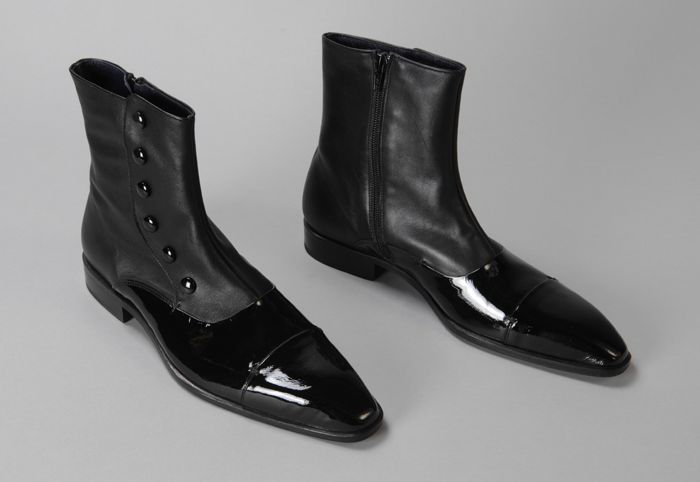 Zwarte halfhoge herenlaars met knopen en lak, "Corbeau"