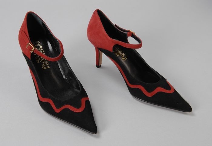 Paar damesschoenen met hoge hak, zwart met rode bies...