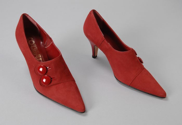 Paar rode suède damesschoenen met hoge hak en knopen...