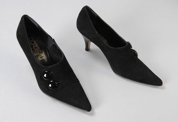 Paar zwarte suède damesschoenen met hoge hak en knop...