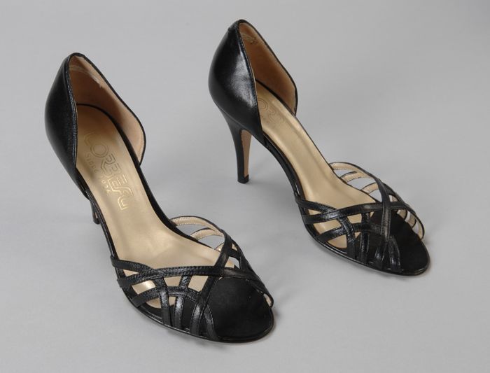 Paar zwarte damesschoenen, hoge hak, open teen, "Cor...