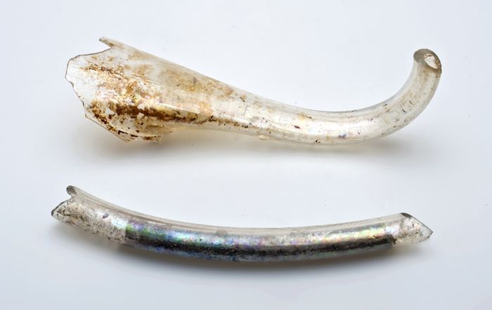Twee fragmenten van glazen oren of schenktuiten, hel...