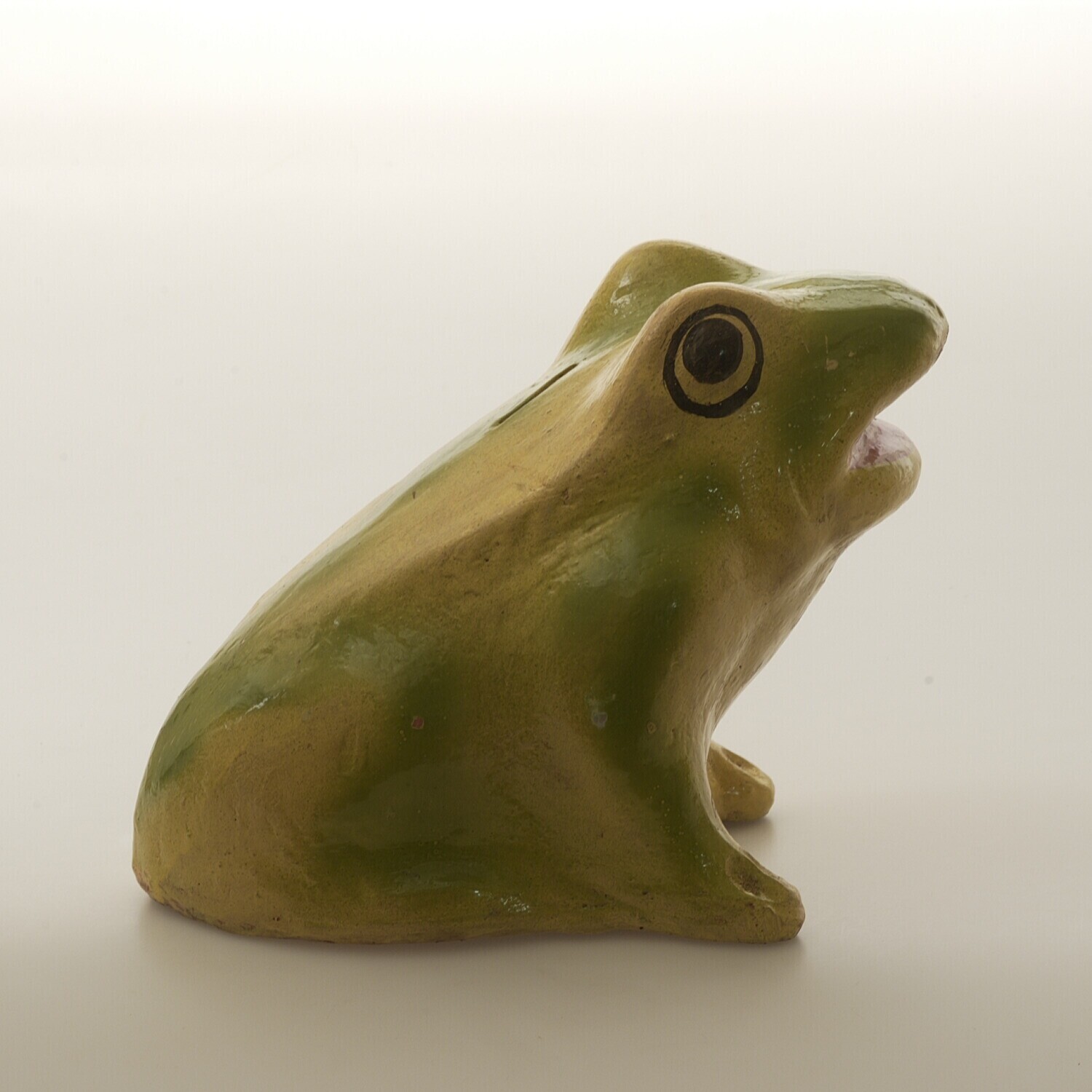 Beschilderde spaarpot van aardewerk in de vorm van e...