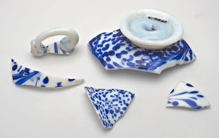 Fragmenten van wit glazen kom met blauwe glasspetter...