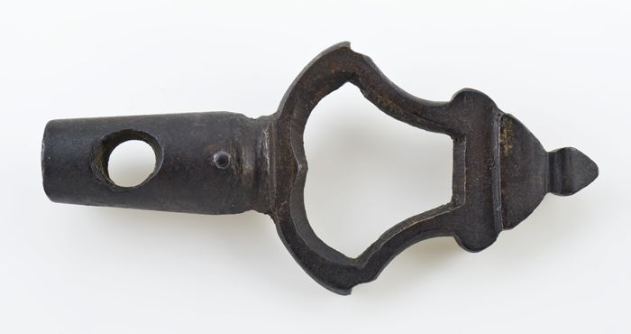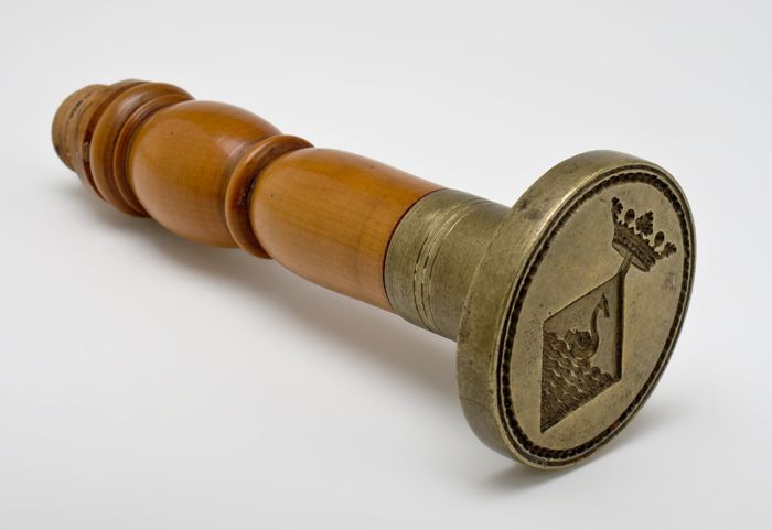 Koperen zegelstempel, hart met gekruiste pijlen op h...
