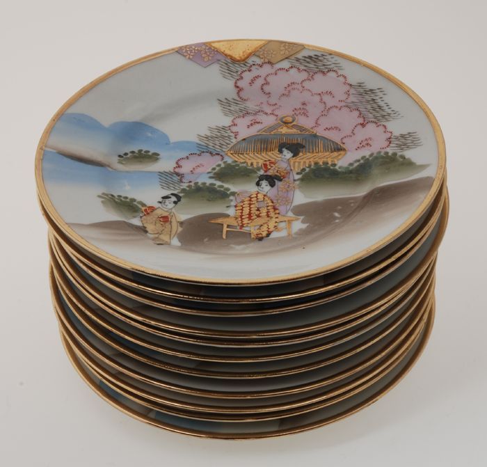 Twaalf bordjes van Japans eierschaal-servies met gou...