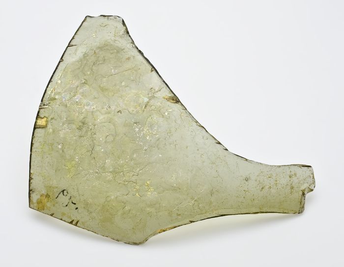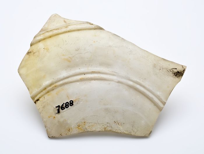 Fragment van glazen schaal, melkachtig glas met twee...