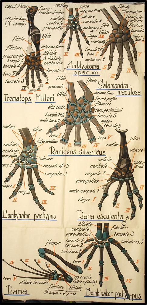 Onderwijsplaat m.b.t. beenderen van de hand/poot