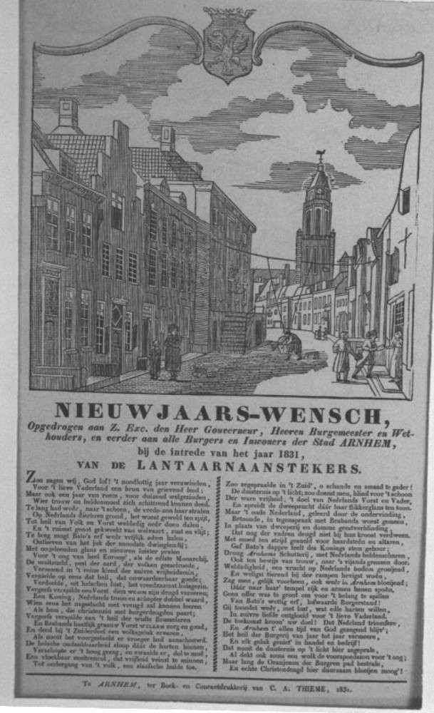 Prent met Nieuwjaarswens Lantaarnopstekers te Arnhem...