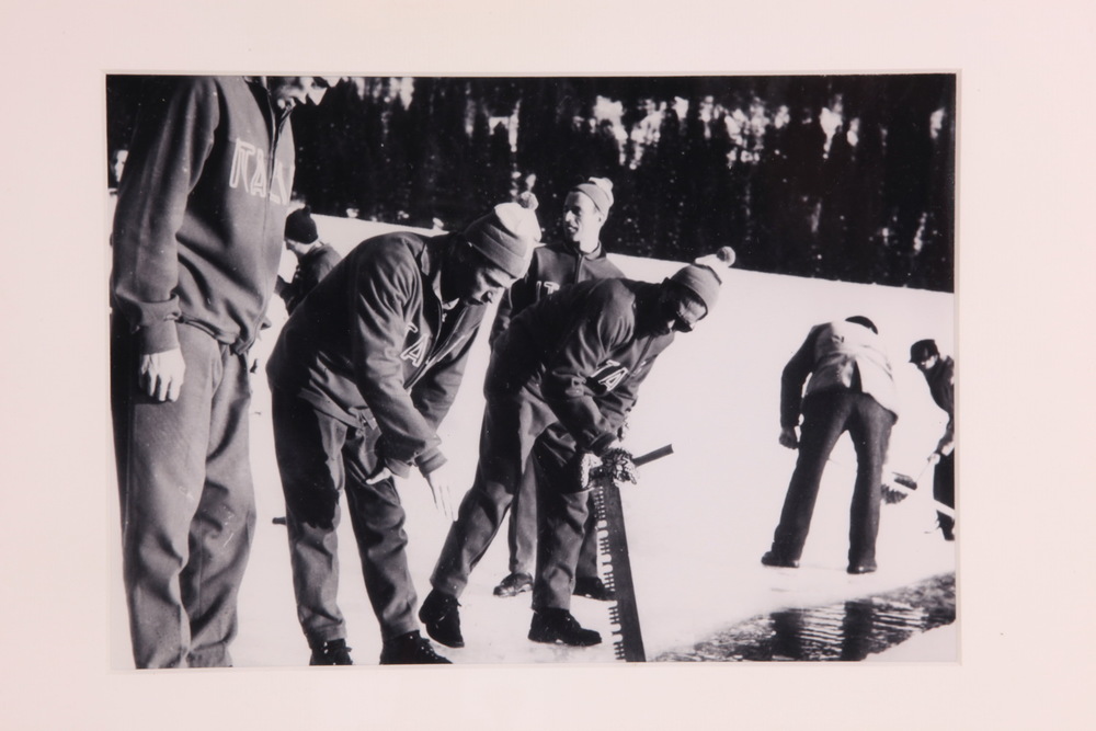 Zwart-witfoto een Italiaans team die aan het ijszage...
