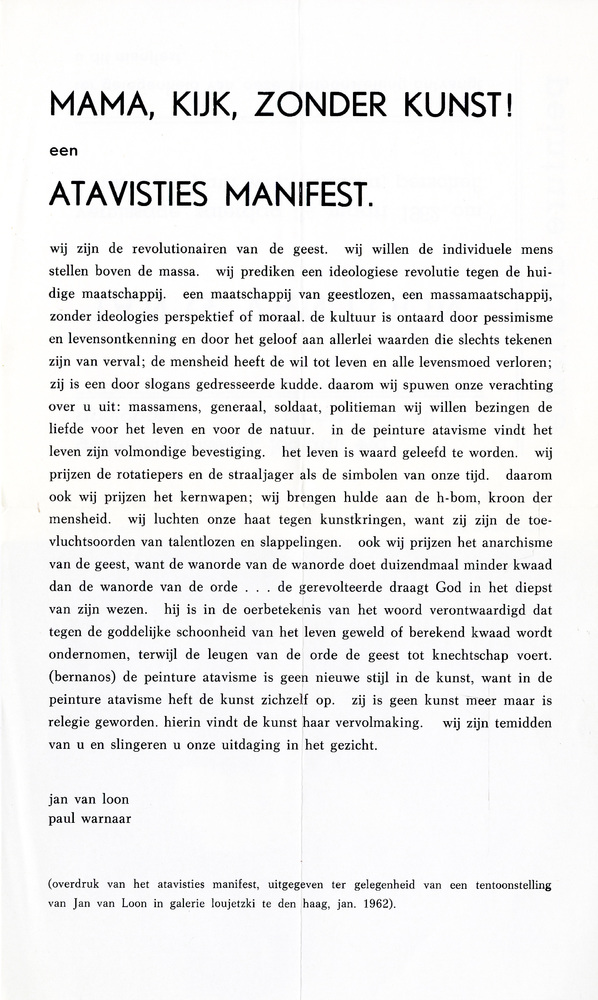 Mama, kijk, zonder kunst! : een atavisties manifest